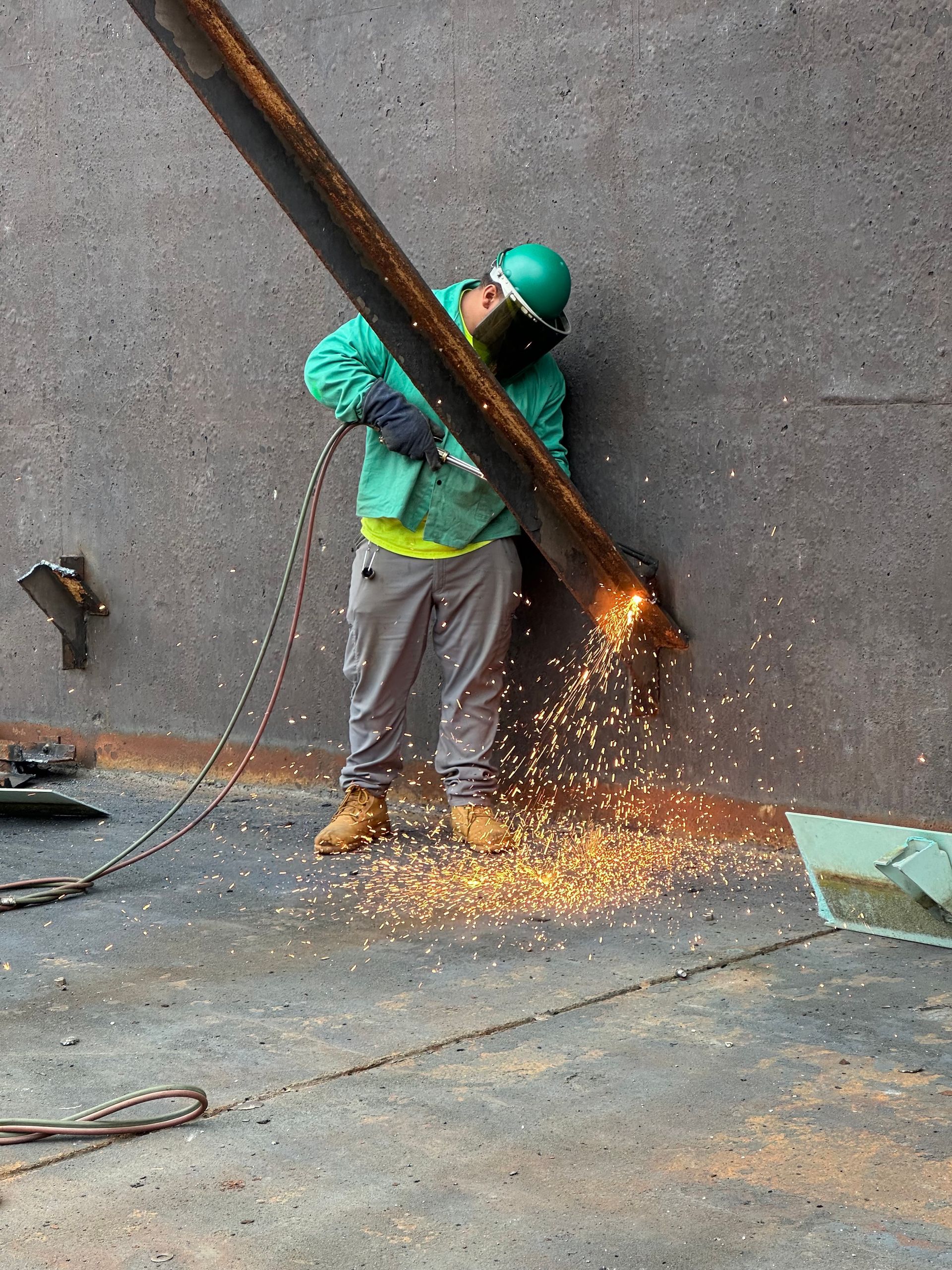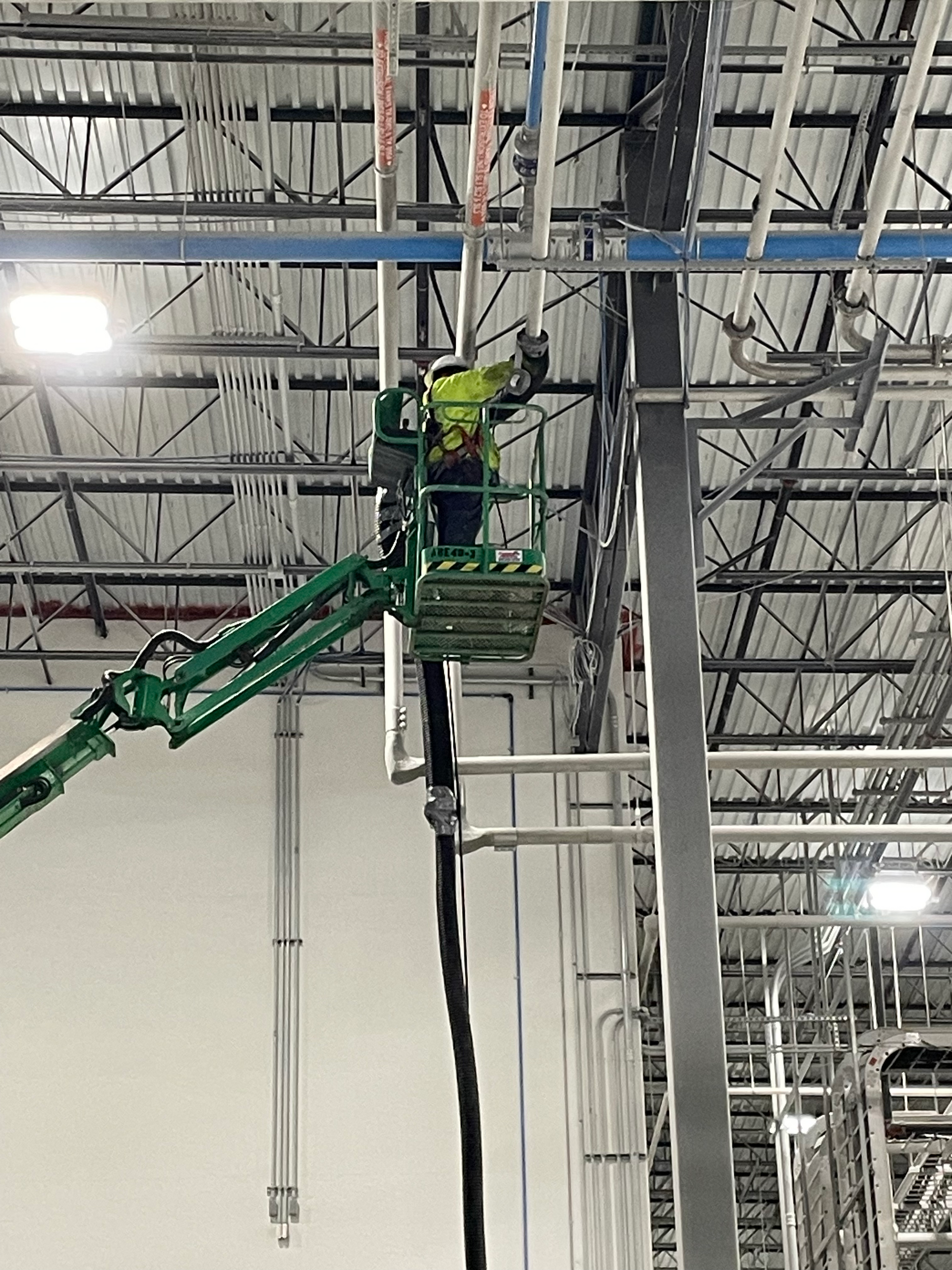 With no on-grade access, they lifted equipment into the structure using multiple cranes, including lowering a JLG 450 AJ articulating boom lift with a 75-ton crane. Once inside the tank, the crew built a scaffold stair tower for long-term access and skillfully removed and lifted every steel piece back out of the tank.