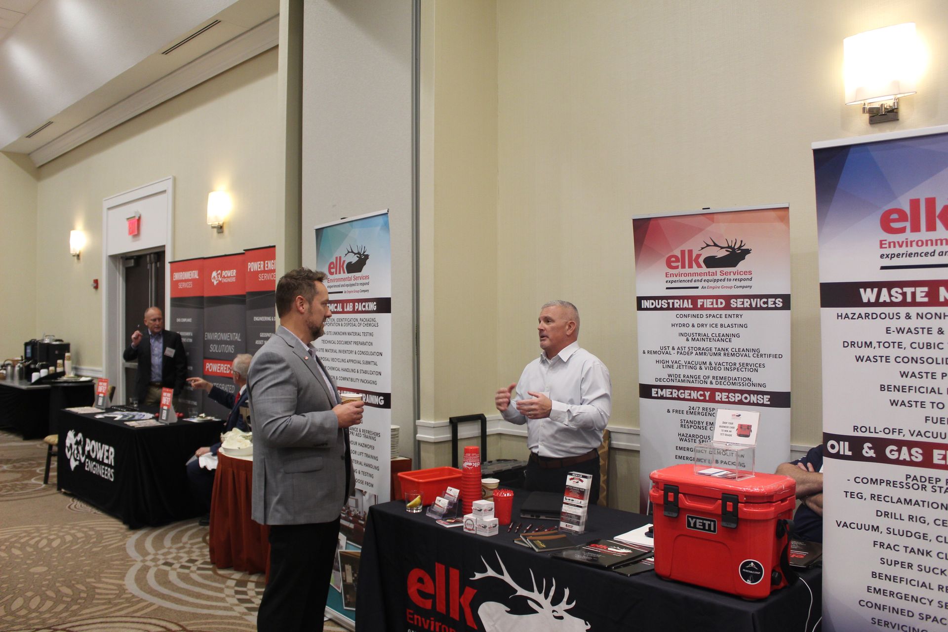 Recently, Elk attended the PA Chamber of Business & Industry’s Annual Environmental Conference in Harrisburg, PA. The conference brings industry leaders, policymakers, and environmental services companies together to learn the latest on environmental policy in the Commonwealth. Below, Elk’s Phil Wagner (L) and Mike Hatzivasilis (R) are ready to provide information on Elk’s services. Phil provides information on Elk’s waste management services to an attendee.